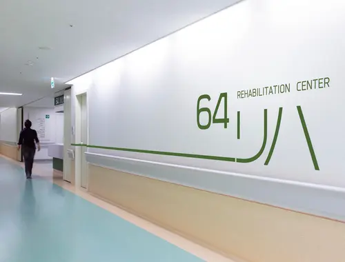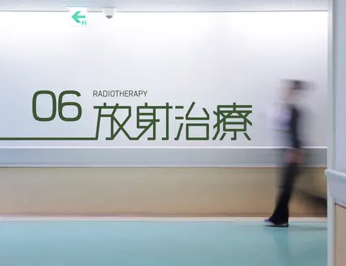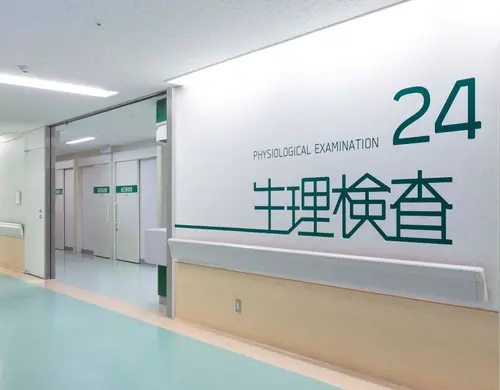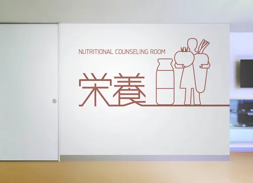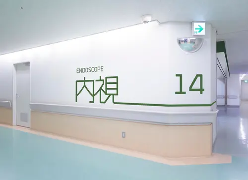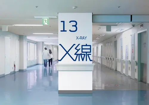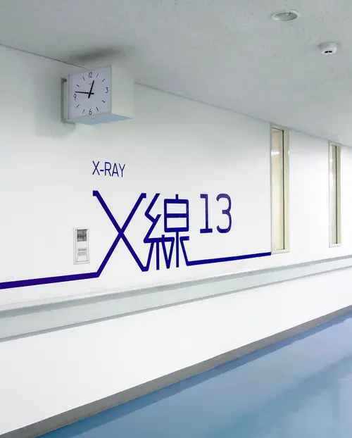 2つの中央診療棟は、それぞれ、長い廊下の途中に診療科を設けている。天吊りの既存サインでは、照明光源を見つめてしまうことになったり、避難誘導灯を隠してしまったり、2400mmの天井高さの廊下では不具合を生じていた。そこで、思い切って、壁面に大きく診療科の「アイコン」を設置し、受付まで長いラインで誘導するデザインを試みた。「アイコン」は、アイキャッチしやすく、受け入れやすいタイポフェイスデザインを行なった。また、2つの中央診療棟は、それぞれ、ブルーとグリーンでカラーリングすることで、現在地(棟)を見失うことも軽減できた。何よりも、殺風景になりがちな長い廊下に、健やかなサインで活気が生まれ、ストレスレスな空間を来院者に提供できれば嬉しい。
