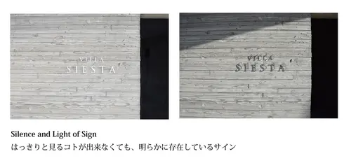 受賞コメント自然風景(海)が一望出来るホテルの名称サインをデザインしました。 杉板型枠で造られたコンクリート壁面に、SUSサインの表面仕上げをバイブレーションにすることで、背景に溶け込ませる『沈黙』を表現しました。 一方、太陽の『光』を受けることで、生み出される影がクッキリとした文字を浮かび上がらせます。 様相の変化と共にサインの表情も変化する事を意識しました。