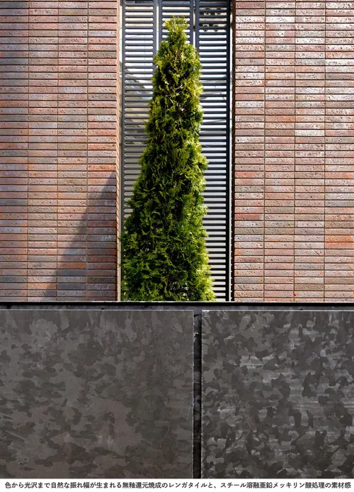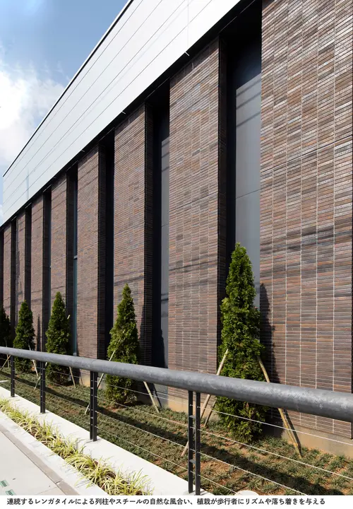 汚れや風化を感じさせず時と共に馴染み、色幅から光沢まで多様になる無釉還元焼成のレンガタイルを列柱状に繋ぎ、合計120m連続させた。ライティングは、その列柱を照らし上げるアッパー照明と、ロゴ・フォントをシンプルに浮かび上がらせるバックライト照明とした。歩道沿いの門塀パネルや境界手すりは、対候性が高く落ち着いた風合いとなるスチール溶融亜鉛めっきリン酸処理とした。