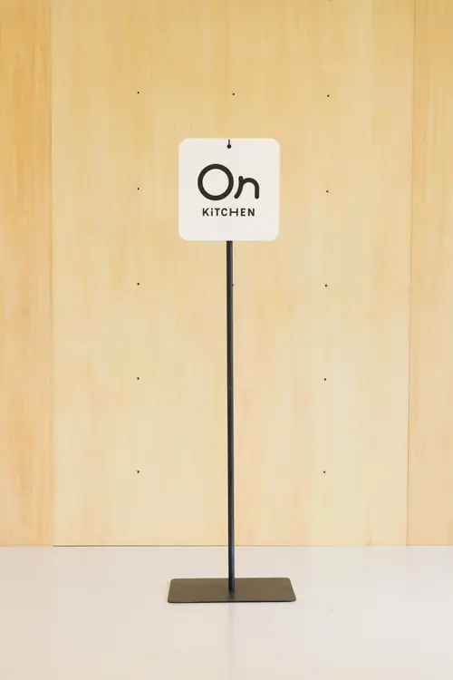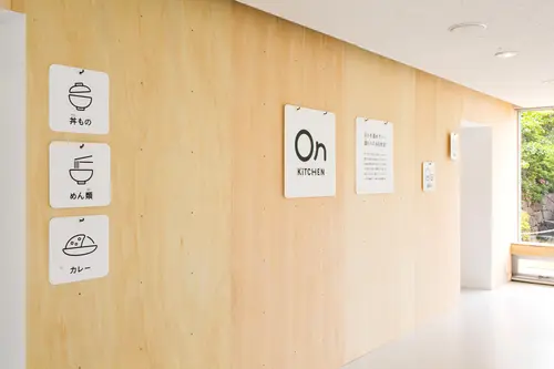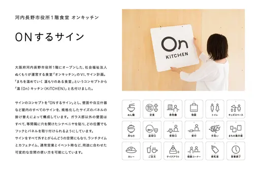 受賞コメントサインのコンセプトを「ONするサイン」とし、壁面や自立什器など屋内のすべてのサインを、規格化したサイズのパネルの掛け替えによって構成しています。ガラス部以外の壁面はすべて、等間隔に穴を開けたシナベニヤを貼り、どの位置でもフックとパネルを取り付けられるようにしています。