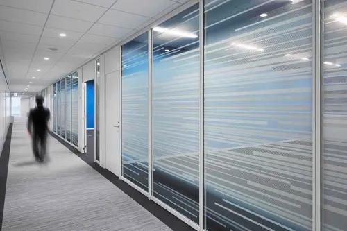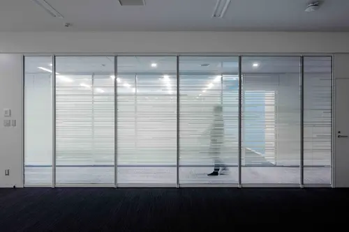 ガラスパーティションで仕切られた訓練室には、上空で窓から流れる雲・気流をイメージした目隠しフィルムによって訓練への集中を高める機能を与えた。