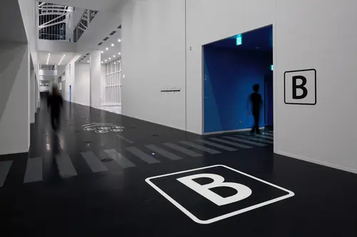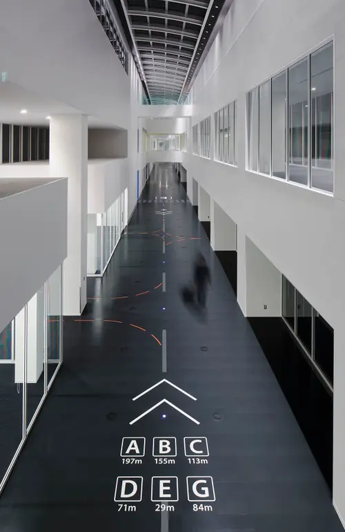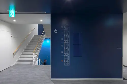 この特徴的な直線約240mの廊下を滑走路に見立てた床デザインにより、目的の訓練室へ通じるEVバンクを明瞭化した。