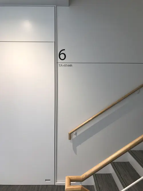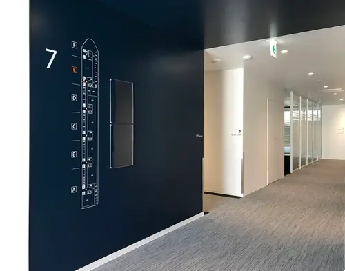 滑走路を経由して基準階へあがったこの空間は、飛行機に搭乗して上空を移動している空間と見立て、フロアマップは機内の座席表をモチーフにしたデザインとした。
