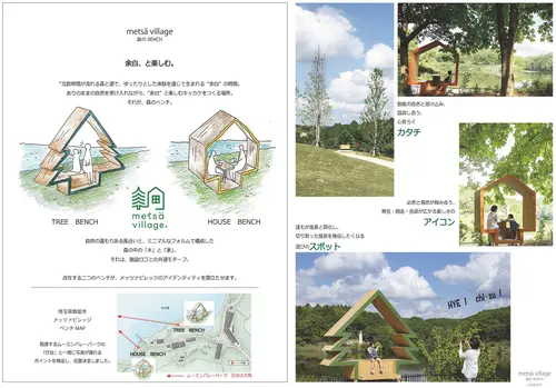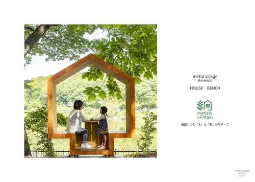 受賞コメント余白、と楽しむ。 “北欧時間が流れる森と湖で、ゆったりとした体験を通じて生まれる“余白”の時間。 ありのままの自然を受け入れながら、“余白”と楽しむキッカケをつくる場所。 それが、森のベンチ。 自然の温もりある風合いと、ミニマルなフォルムで構成した 森の中の「木」と「家」。 それは、施設ロゴとの共通モチーフ。 点在する二つのベンチが、メッツァビレッジのアイデンティティを際立たせます。