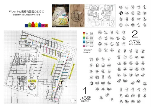 受賞コメントひとつの部屋を一軒の家と見立て「家形」を並べた群集合により、この「単体建築」は「集落」になりました。この計画では、知的障がい児が、木造の心休まる空間に包まれることを期待するものです。「ここが私の家。」と思ってもらえるサインデザインを目指しました。パレットのような「いろ壁」に「わたしはみどりのおうち」、動植物図鑑のような「へや印」に「カブトムシのボクんちにおいでよ」という声を聞いて感動しました。