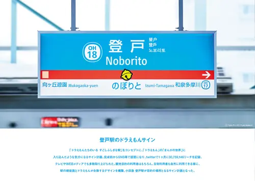受賞コメント「ドラえもんたちのいる すこしふしぎな駅」をコンセプトに、「ドラえもん」の「まんがの世界」に入り込んだような気分になるサイン計画。完成前からSNS等で話題になり、twitterで1ヶ月に30,759,146リーチを記録、テレビやWEBメディアでも多数取り上げられた。観光目的の利用者はもちろん、日常利用者も自然に利用できる様に、駅の機能面とドラえもんが合致するデザインを構築。小田急 登戸駅が目的の場所となるサイン計画となった。