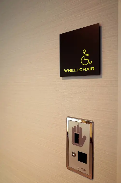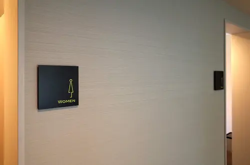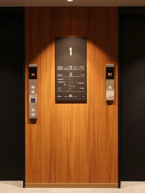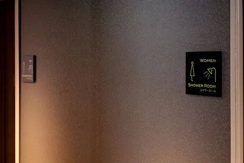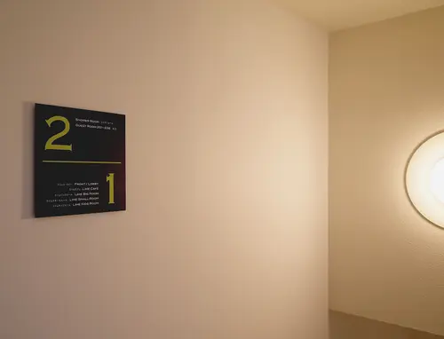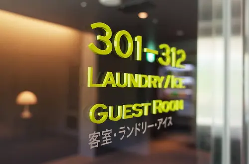 エントランスのロゴサインを起点に、そのイメージからの連続性を持たせるため英字を主とし書体を選定、ピクトグラムもロゴデザインに合わせライムグリーンのライン構成で統一した。
