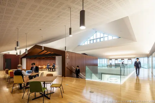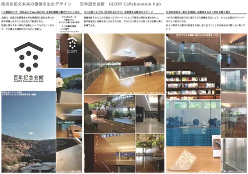 受賞コメント通貨処理機シェアNo1にして独自の「見分けるチカラ」を活かし新規市場開拓に取組むグローリー社の研修施設である。企業理念「求める心とみんなの力」を1つ屋根の下で育むワンルーム空間では、自然の恵みを感じさせ多様な居場所とアクティビティが連鎖する環境と、社の魅力を伝え知的好奇心を擽るメッセージが響き合う。原点に立ち返り未来のヒントを生む多様な機会の提供が、社会の求める「新たな信頼」を創造する人を育てる。