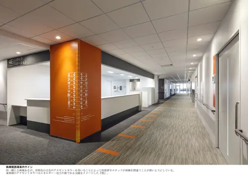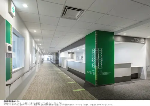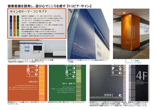 受賞コメント健康志向が高まっている昨今、さりげなく健康意識を誘発できるサインシステムとして、健康のバロメーターである様々な記録を『トリビア』として記載し、それらを数値化した『目盛り』をサインのデザイン要素に取り入れた。病院という機能的な空間の中で、診察待ちの患者や来院した子供たちに快適に過ごしてもらうために、遊び心でこころを癒し、自身の体に関心を持ってもらえるような「しかけ」を院内に展開している。