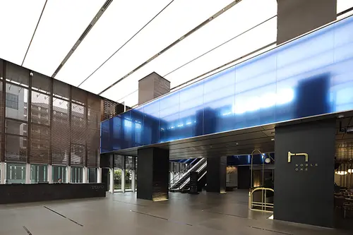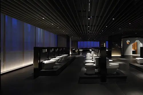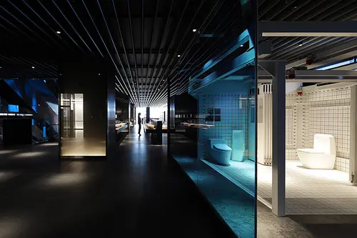 本案件を、くらしにおけるインテリアの重要性を、清涼な水が生み出す豊かな生活体験を想起する場創りとして捉え、TOTOのCIブルーをイメージさせる「都市を映す水の光」のエントランス、