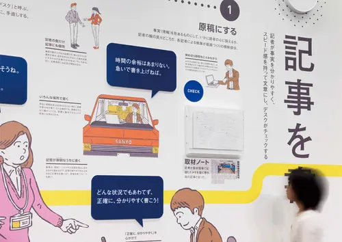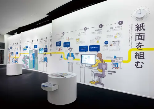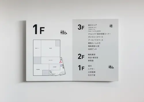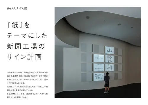 作品意図『紙』をテーマにした新聞工場のサイン計画 山陽新聞社の印刷工場・見学施設の展示・サイン計画です。新聞の印刷から配送までの工程、役割や歴史を楽しく学べるように、イラストもふんだんに用い、分かりやすく表現しています。 案内サインには、新聞の形を模したサインを施し、本施設の特徴を象徴的に表しています。 また、外構には、「工場」を象徴するように、大きくて無骨なサインを展開しています。