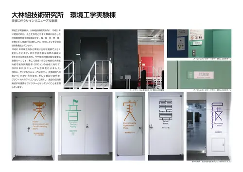 同時に、サインもリニューアルを行い、技術開発への思いや、向かい合う姿勢、そして施設の説明を、グラフィカルなアイコンとして表現し、施設の空間を構成する重要なファクターとなっていくことを意図しています。