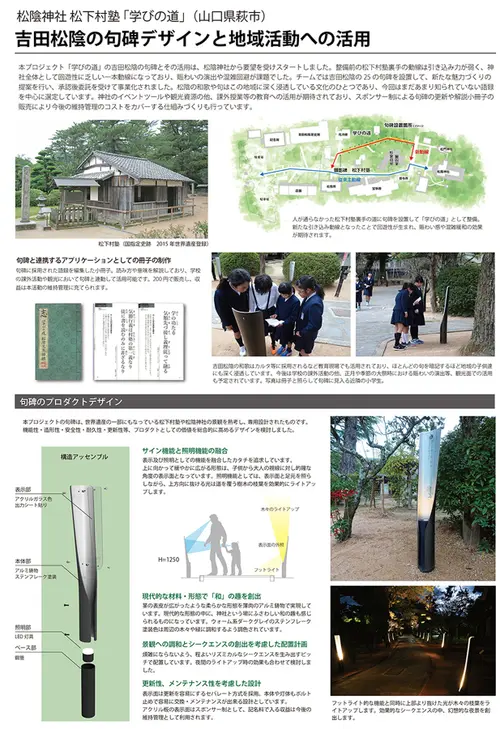 「松下村塾」の外周道に吉田松陰の句碑を25基設置し、「学びの道」として整備したものです。照明機能をもたせた句碑は、神社に昼夜にわたり新たな景観と動線を創出するとともに、地域における教育・観光資源としての活用も実施されています。