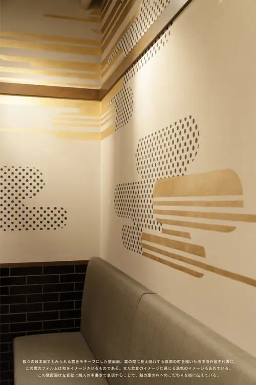 受賞コメント京都発祥のラーメン屋 魁力屋の居酒屋新業態。コンセプトは“魁(さきがけ)感のある酒場”。社是「実直さ・おもてなし・時代を先駆けること」を表す為、骨太で親しみやすい印象にロゴやサインで新しさを取り入れた。典型的な居酒屋のシンボルである提灯や暖簾にポップなロゴやロゴを元にしたパターンを配している。また湯気と洛中洛外図に描かれる雲より発想した壁面画は手書きとすることで魁力屋の味へのこだわりを暗に伝える。