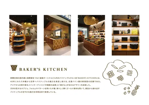 受賞コメント那覇空港の国内線と国際線をつなぐ連絡ターミナルビル内のパイナップルタルト店「BAKER’S KITCHEN」は、40年にわたり沖縄から世界へパイナップルの魅力を発信し続ける、名護パイン園の新業態の店舗である。