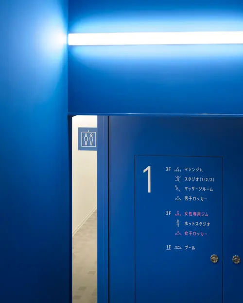 多様な設備を、利用者に直感的でわかりやすくするため、3つのフロアの特徴をそれぞれ色で意識づける計画としました。色は、吹き抜けの柱や階段室の壁面などにも展開され、空間全体がサインのインターフェイスとなっています。
