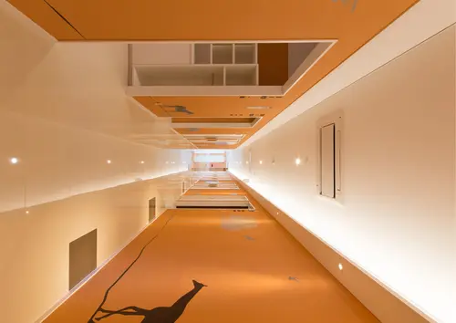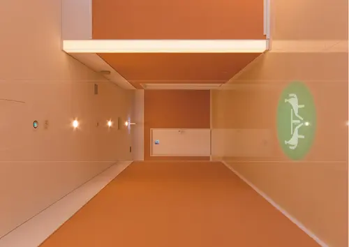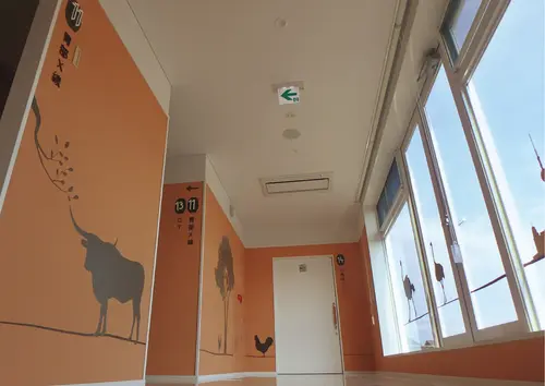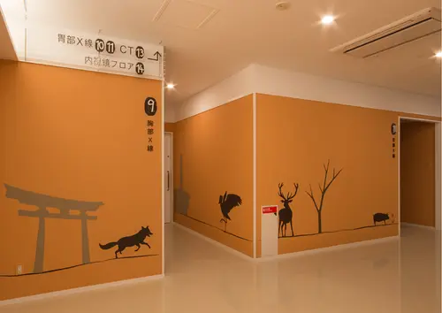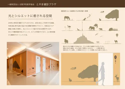 受賞コメント健診をリラックスして受けてもらえるよう、通路壁面で動物のシルエットが次々と誘導するユーモアあるサインに仕上げた。