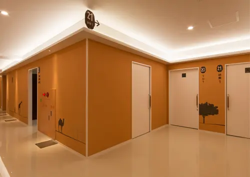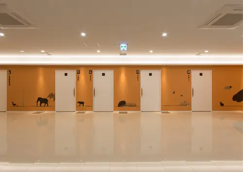 また通路は、珪藻土に間接照明が設置されており、照明に映えるよう立体感のあるサインに仕上げ、光とシルエットで作る温かみのある癒しの空間にした。