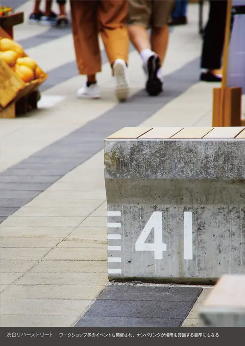 かつて線路を支えていた高架柱の管理用のナンバリングを、場所の記憶として表出させた。環境演出としての要素とイベント開催や待ち合わせ場所等の目印としての機能も有する。