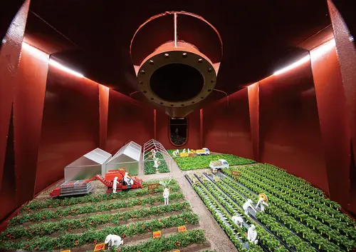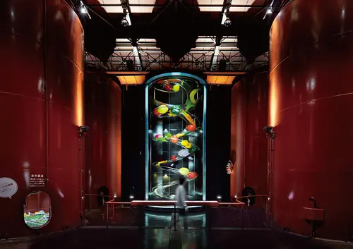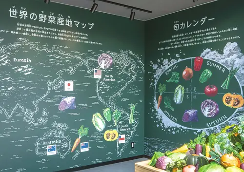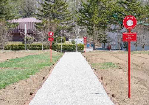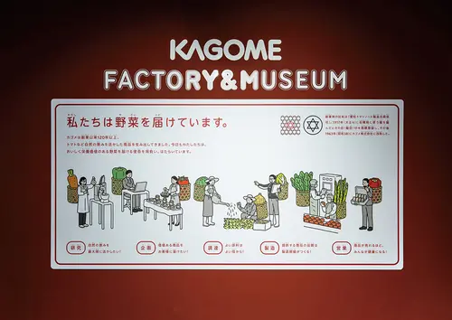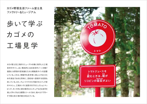 作品意図カゴメ富士見工場のリニューアルを機に制作した工場見学のサイン。広い敷地内にある各見学ゾーンを繋ぐ通路には野菜の豆知識を入れた標識風サインを設置している。これは、移動中も見学者に楽しんでもらうための演出であると同時に、目的地へ誘導する役割も担っている。また、チョークイラストが描かれたパック型のマルシェ、工場タンクに投影するプロジェクションマッピング、タンク内に潜む精巧なミニチュアなども見学を楽しく学んでもらう重要なツールであり、様々なアプローチで富士見工場の魅力を伝えている。