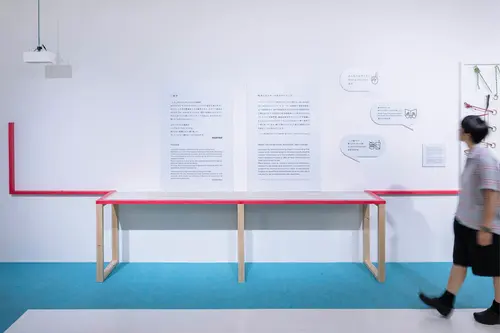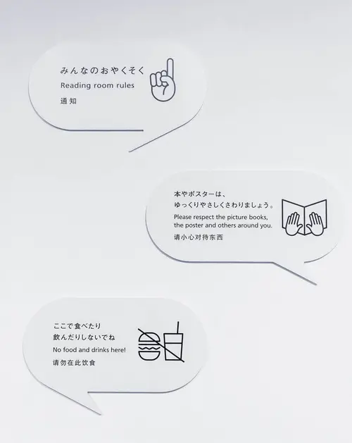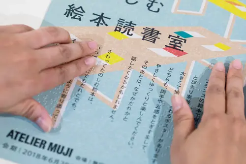 目のみえない子どもたちのために、フランスの絵本工房で手作りされた絵本とさわるポスターの展覧会会場グラフィックとサインを制作した。今回は不特定多数の来場客のみならず、盲学校や専門施設を通じて目の見えない方々を招待し、実際に触れて感じるための会場と絵本の展示構成を考案した。導線をうながす手摺り、点字のキャプション、点字入りチラシ、音声ガイダンスなど、点字図書館ほか専門分野の方々に幾度もヒアリングを行い、ユニバーサルな空間づくりを試みた。