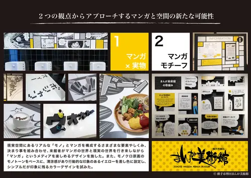 受賞コメント現実空間にあるリアルな「モノ」とマンガを構成するさまざまな要素やしくみ、決まり事を組み合わせ、来館者がマンガの世界と現実の世界を行き来しながら「マンガ」というメディアを楽しめるデザインを施した。また、モノクロ原画のモノトーンをベースに、清涼感があり行動的な印象のあるイエローを差し色に設定し、シンプルだが印象に残るカラーデザインを試みた。