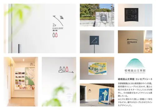 受賞コメント京都嵯峨嵐山にある美術館。 ロゴデザイン、サイン計画を含めたトータルでのブランディングディレクション、デザインを担当。 美術館のリニューアルに合わせ、 嵐山と桂川の流れをモチーフにしたロゴを制作し、 その曲線を生かしてサインにも展開している。 山と川に囲まれた美しい景観と一体化するように、 緩やかなカーブにのせたサインをデザインした。