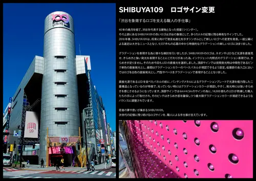 SHIBUYA109のロゴは、ネオンやledの直接光できらめきを表現することに強いこだわりがある。直接光源であるLEDを並べたパネルの前に、同ピッチのパンチングメタルによるグラデーションプレートを設置した二重構造となっているのが特徴で、光っていない時には極力光源を目立たせずグラデーションカラーを視認でき、発光時には強いきらめきを感じさせる。6m×4.5mメートルのサインの為に、14000個ものled が熟練した職人たちの手によって植え込まれており、次世代の記憶を作るロゴサインを、職人による手仕事が支えている。