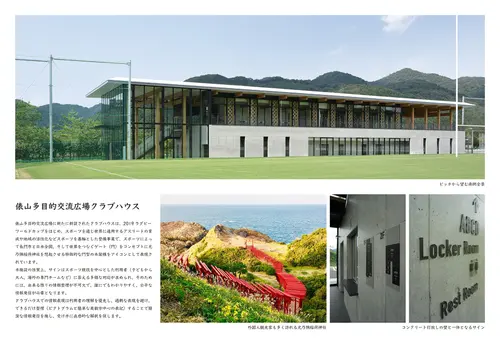 受賞コメント俵山多目的交流広場に新たに新設されたクラブハウスは、2019ラグビーワールドカップをはじめ、スポーツを通じ世界に通用するアスリートの育成や地域の活性化などスポーツを基軸とした整備事業で、スポーツによって長門市と日本全国、そして世界をつなぐゲート(門)をコンセプトに元乃隅稲荷神社を想起させる特徴的な門型の木架構をアイコンとして表現されています。