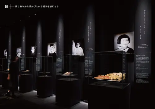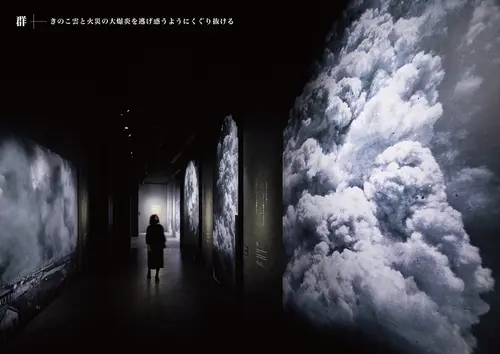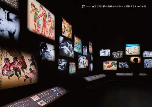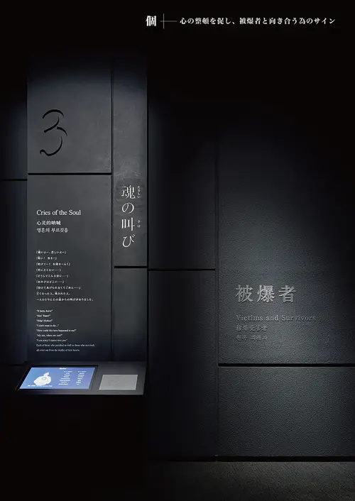 「被爆者の視点」で計り知れない惨状の記憶の追体験をすることを試みた。その為に、資料、感情、言葉(動画内)、サインを取り巻く空気を大切に捉え、闇に浮遊する情景として記憶の顕在化を図った。又、無差別性を語る「群」と1人1人の嘆きを語る「個」の展示を明快に分け、あらゆる立場の被爆者の魂の叫びを世界中の人々に届ける空間を目指した。