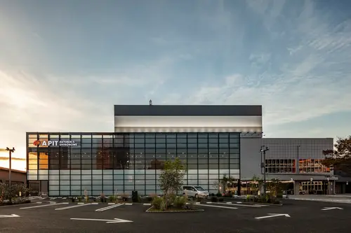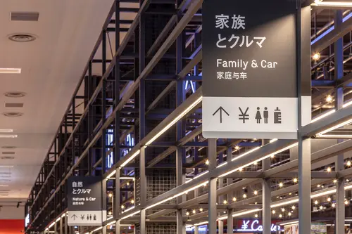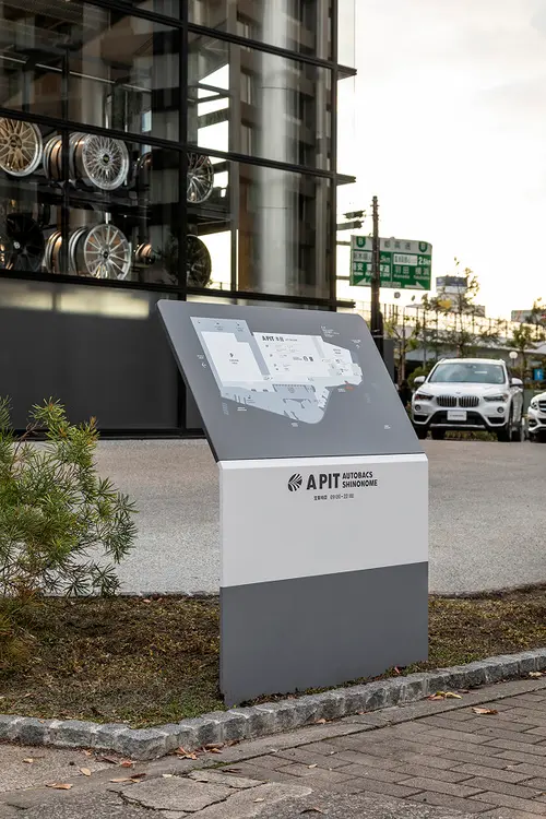 1Fは従来通り車検を中心とした、車のメンテナンスができる。店舗の礎であるこのフロアの壁面を彩る3色のグレーが、お店全体のアイデンティティとなっている。サイン計画はこの3色のグレーをベースにシステム化しながら、2Fの店舗では、道路のように一本に繋がるネオンサインが楽しさを演出している。