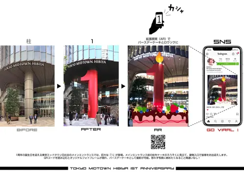 受賞コメント東京ミッドタウン日比谷の1周年を華々しく祝福するプロジェクト。 超高層を支える構造体の一部である巨大な柱を、一瞬にしてアート空間に生まれ変わらせることを意図した。 人々が行き交うステップ広場に都市スケールの真っ赤な「1」を出現させ、ビッグスケールの赤いデコレーションは、周囲のビル街にも彩りを添える。バースデーケーキの赤いロウソクに見立て、特別に作成されたアプリでAR体験もできる仕掛けを用意した。