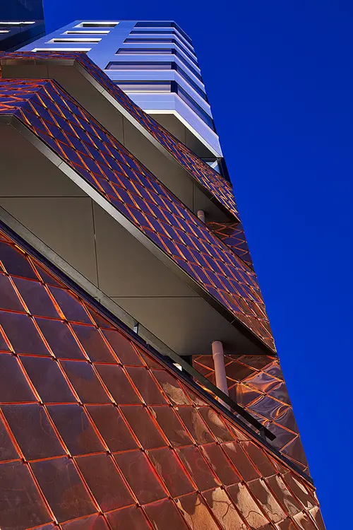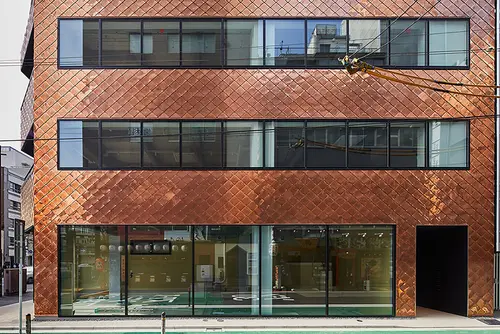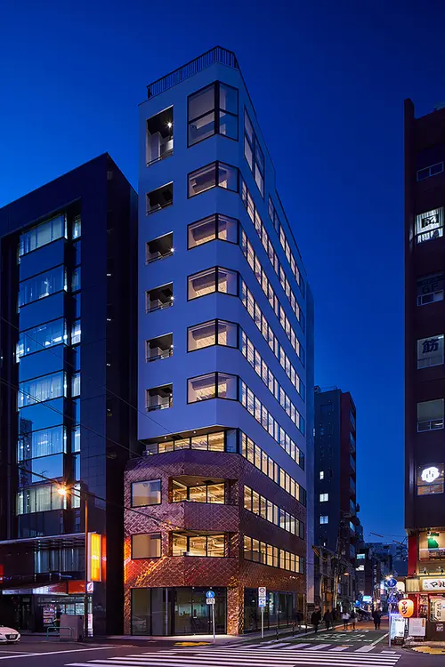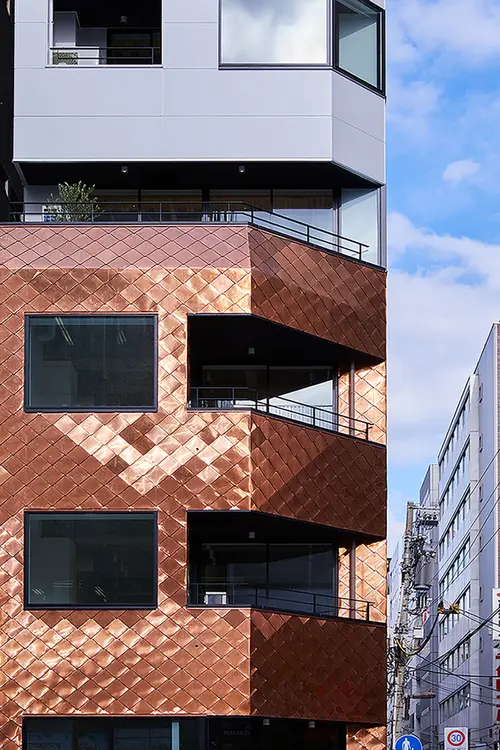 受賞コメント神田鍛冶町の一角に建つ飲食・オフィス・賃貸住宅の新築複合ビル。ここに集まるヒト・モノ・コトを鍛冶屋の街らしく熱いうちに打って街を鯔背に盛り上げたいという思いから、鍛冶屋が多く存在していて金属音が響いていたこと、看板建築が多く存在していたという背景から銅の菱葺き仕上を採用。銅そのものの経年良化を時の流れと共に感じるものとし、角打ちらしく角を折曲げ、正面性を曖昧にし、地域に対して開放的なものとした。