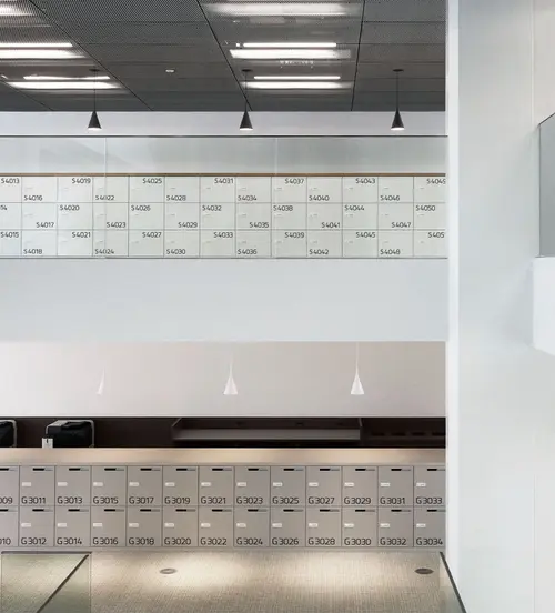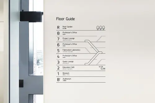 サインは、自由な使い方のオープンスペースであるがゆえ必要となるアドレスをアイコンと捉え、縦横に通る柱と梁を用いて、空間の特徴と一体化した表現とした。
