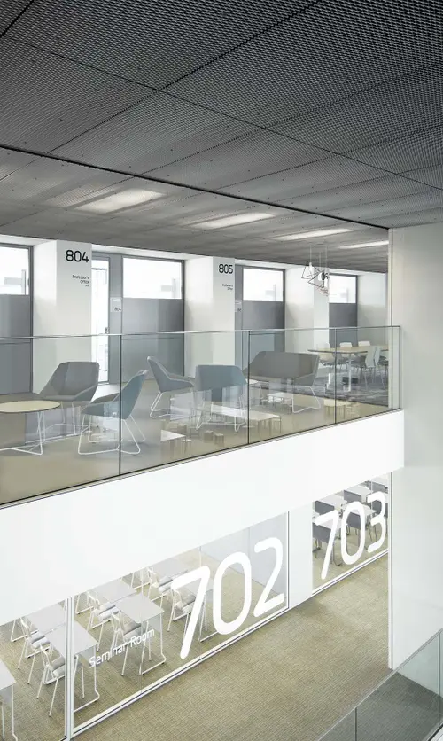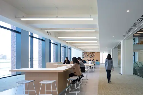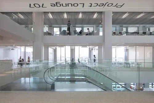 受賞コメント経済学部新設によって新築された棟のコンセプトは「シェアードスタジオ」。従来型の細かく分断された教室というスタイルから脱却した開放的な学びの場である。中央吹き抜けのエスカレーターを主動線として空間は、縦横、そして外部にも視覚的につながり、人の活動も空間全体をつかって流動的に行われる。