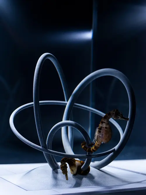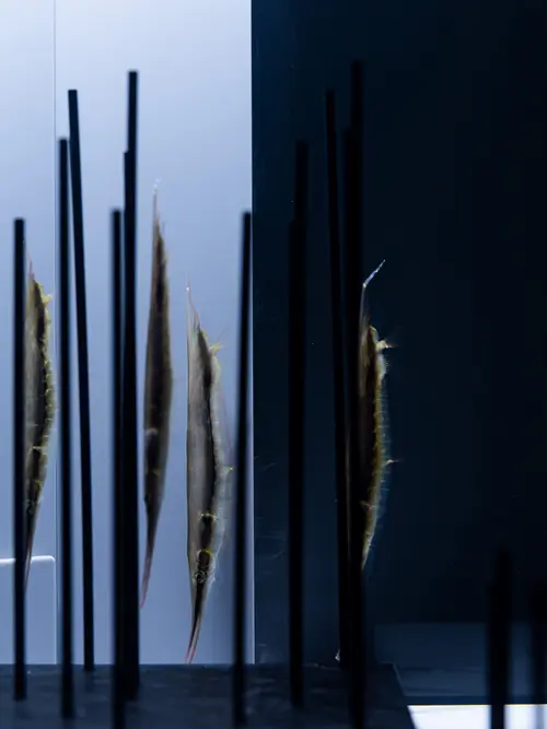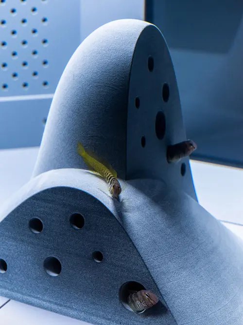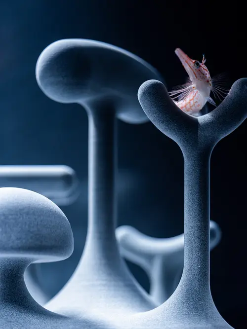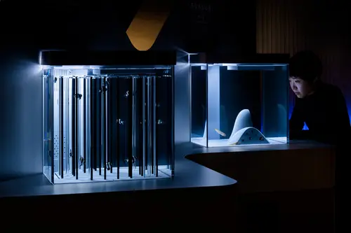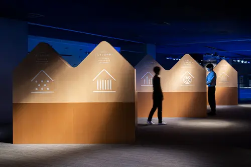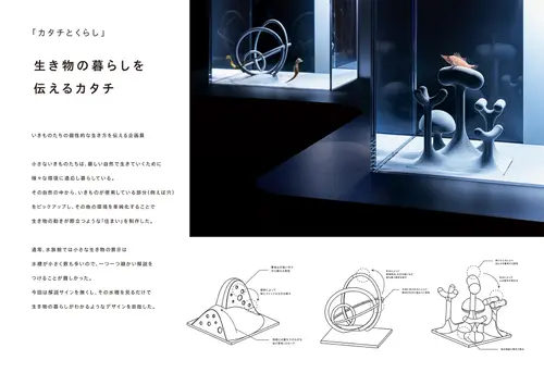 受賞コメント「カタチとくらし」は、いきものたちの個性的な生き方を伝える水族館の企画展示です。小さないきものたちは、厳しい自然で生きていくために様々な環境に適応して暮らしています。その自然の中から、いきものが使用している部分(例えば穴やサンゴの高台) をピックアップし、それ以外の環境を単純化することでいきもの動きが際立つような「住まい」を制作しました。 通常、水族館の小さないきものは水槽が小さく数が多いので、一つ一つ細かい解説をつけることがなかなかできませんでした。今回は解説板をなくても、その水槽を見るだけでいきものの暮らしがわかるようなデザインを目指しました。