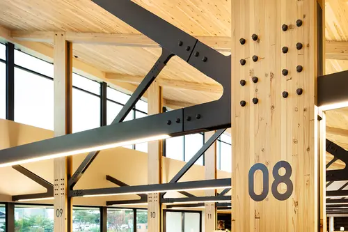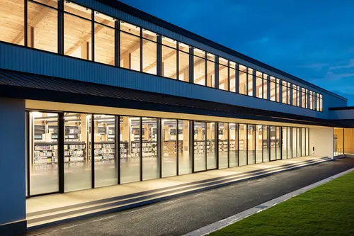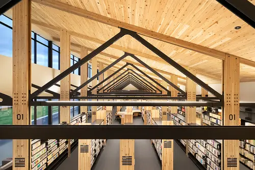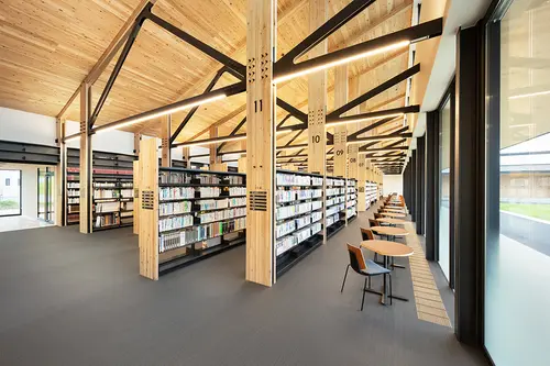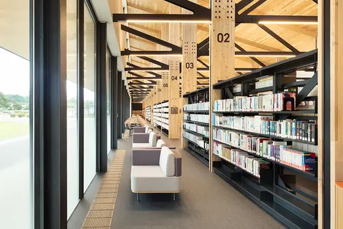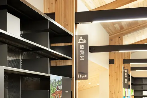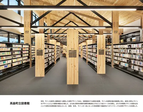 受賞コメント家具、サインを基準に建築設計へ展開した空間デザインである。 図書館設計では書架の配置、サインの誘導計画が最重要と考え、最初に家具とサインをデザインした上で建築の構造を計画した。 立ち並ぶ書架の側板を建築の構造柱とすることで省スペースを実現し、またその側板にサインを組み込むことで空間の位置把握が容易となった。 建築、家具、サインが一体となった単純明瞭で機能的かつダイナミックな空間デザインを実現した。