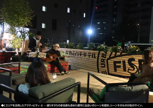 環境全体が都市での新たな過ごし方を示すサインであるとともに、各サイン(スポンサー広告、記名サイン他)においては、多様なシーンの背景として調和しながらも、存在感を感じられるように考慮した。