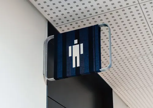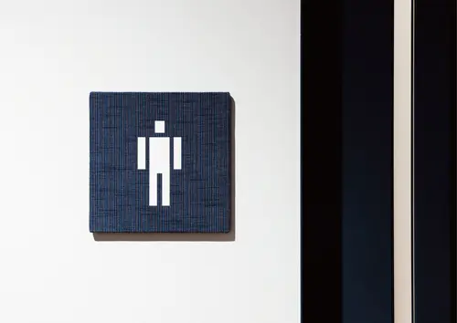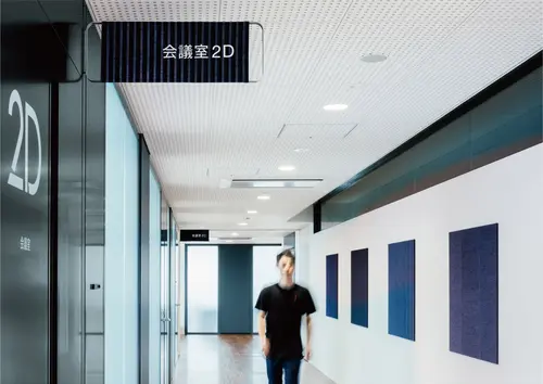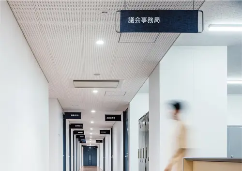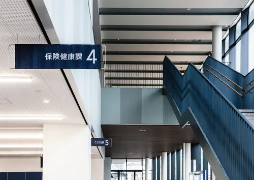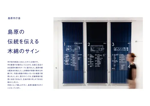 市を象徴する場所ということから、伝統工芸品である島原木綿をモチーフに選びました。島原木綿は藍染糸を地とした、しま模様が特徴の素朴な木綿です。今回は複数の柄をいろいろな場面で使用しました。また、窓口サインでは、記載情報の変更に対応できるよう、生地の取り外しができる仕組みにしました。