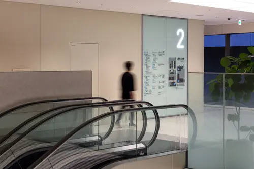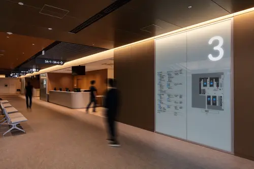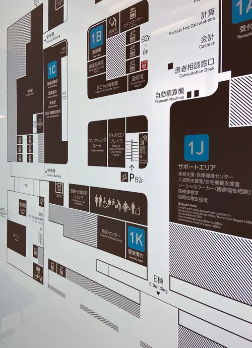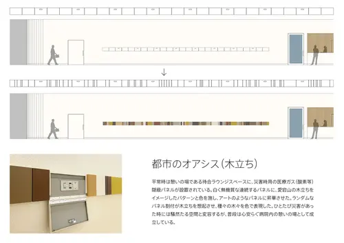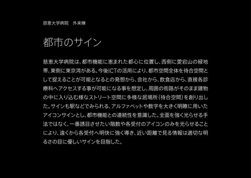 受賞コメント都市機能との空間的な連続性を意識し、駅などでみられるアルファベットや数字を大きく明瞭に用いたアイコン重視のサイン計画とした。 一番誘目性をもたせたい階数や各受付のアドレスのみを光らせることにより、各受付へ明快に強く導き、近い距離で見る情報は適切な明るさの目に優しいサインを目指した。 外周部軒天井面には設備に必要な開口率を確保した複数の孔による葉の重なりを表現したパターンを施し、ラウンジ等の人々が集まる場を顕在化させた。 そのままでは無機質な災害時用の医療ガス隠蔽パネルには、近隣の愛宕山の木立ちをイメージしたパターンと色を施し、病院内の憩いの場のコミュニケーショングラフィックスとして成立させた。