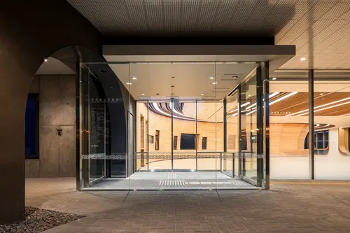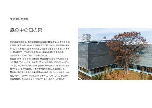 全体デザインコンセプトは「森の中の知の泉」。隣接する都立多摩図書館ではプラタナスのシルエットを環境グラフィックスとして取り込んだのに対し、公文書館ではケヤキのシルエットを取り込み、「森の中で歴史を知る」を表現した。