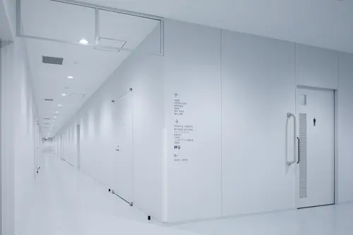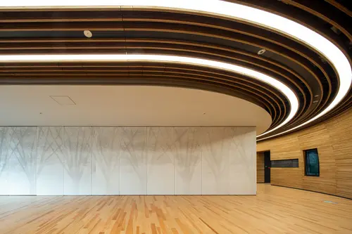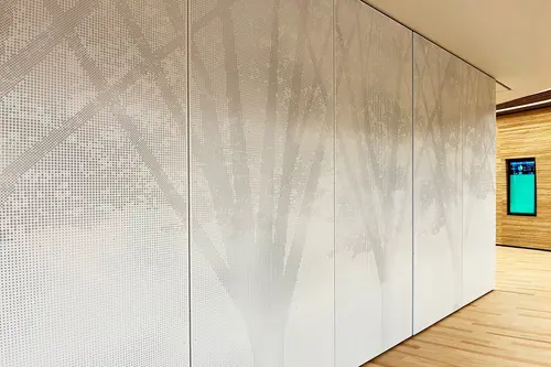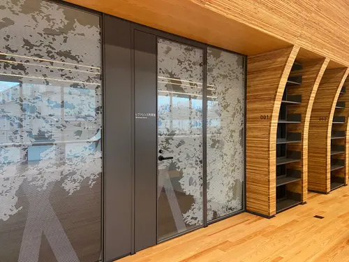 研修室を取り囲む掲示の出来る可動式の有孔パネルにはオリジナルの有孔パターンでケヤキのシルエットを表現し、レファレンスなどのガラス面の飛散防止フィルムにはケヤキのグラフィックパターンを施した。
