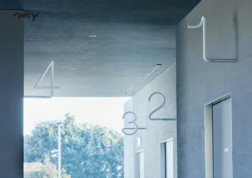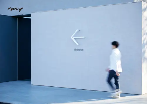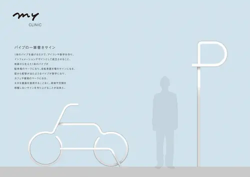 通常よくあるサインのように、盤面に文字表示するサインでは空間や景色の邪魔をし、窮屈な印象になると感じていたので、地面や壁面から生えた1本のパイプを曲げて、アイコンや数字になるようなサイン計画を考えた。