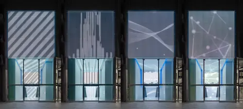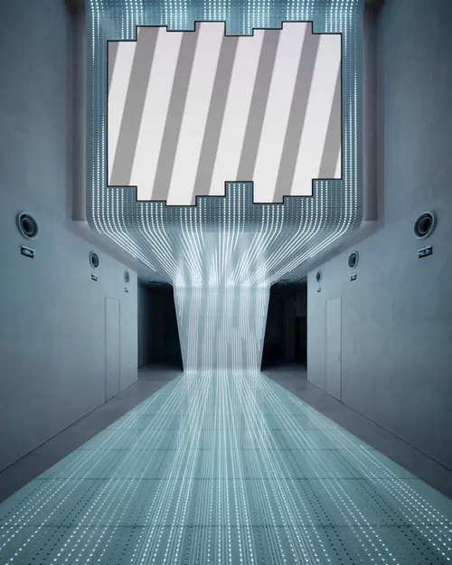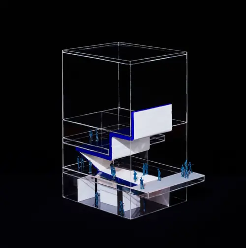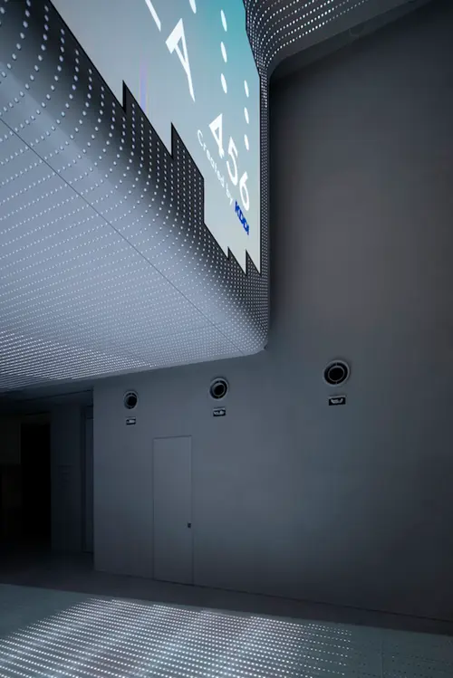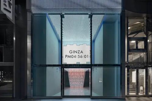 この場所は東京・銀座の中心地に存在しつつも、周囲のブランドショップに比べてファサード面積が限られていたが街に対して存在感を持つ工夫が求められた。そこで、立体的な都市のサインとして建築自体を設計することにした。このサインは巨大なLEDでできていて、一体のサインがファサードと内部を連続させ、限られた外部だけではなく、細長い敷地の奥行きを活かす立体的なグラフィックとして機能する。外部の壁面から吹き抜け、天井、床まで一つの面としてLEDで作った映像と体験が混ざる可変空間としてサインの仕組みごとデザインした。この連続した空間にKDDIがブランドや季節に応じたコンテンツを映し出し、街や来店する人にメッセージや体験を提供する。連続した壁面はユニークな投影面となり、その立体形にあったコンテンツも空間やインテリア素材と並列に扱い一体でデザインしている。