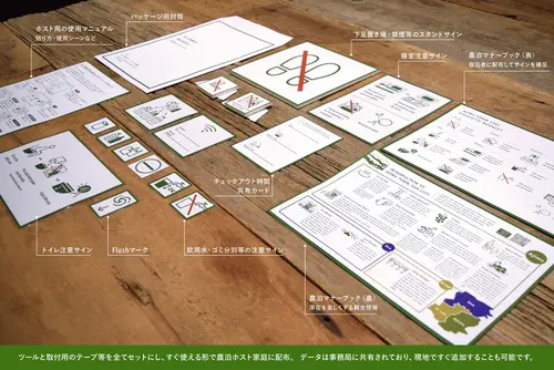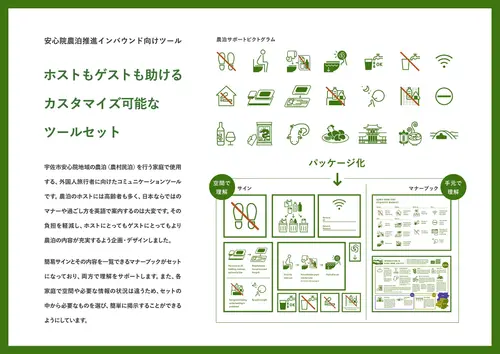 受賞コメント宇佐市安心院地域の農泊(農村民泊)を行う家庭で使用する、外国人旅行者に向けたコミュニケーションツールです。農泊のホストには高齢者も多く、日本ならではのマナーや過ごし方を英語で案内するのは大変です。その負担を軽減し、ホストにとってもゲストにとってもより農泊の内容が充実するよう企画・デザインしました。 簡易サインとその内容を一覧できるマナーブックがセットになっており、両方で理解をサポートします。また、各家庭で空間や必要な情報の状況は違うため、セットの中から必要なものを選び、簡単に掲示することができるようにしています。