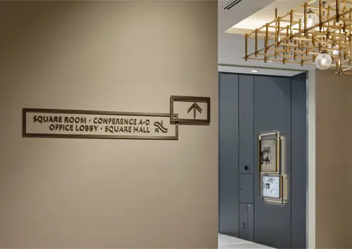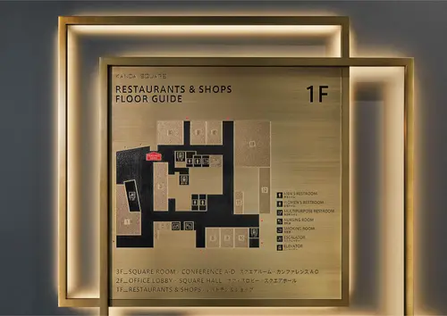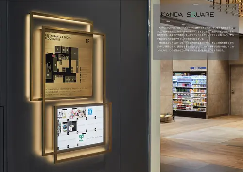 受賞コメントKANDA SQUAREでは、ファサードや空間デザインで用いている千鳥形状からスクエア形状を抽出し、サイン形状のモチーフとすることで、施設内サインの統一感を持たせつつ、商業部・共用部・ホール・カンファレンスの各エリアで使用しているマテリアルをサインデザインに取り入れ、それぞれのエリアの空間デザインとの調和を図っている。