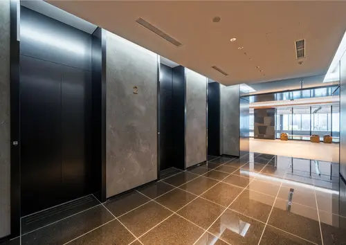 駅と接続する低層部は吹き抜けを中心にオフィスと商業施設が共存している。
