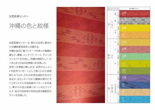 受賞コメント友愛医療センターは、豊かな自然に恵まれた沖縄県豊見城市に位置する。沖縄の自然に基づくテーマを持った階層計画など、建築、インテリア、アート、サインがコンセプトを共有し、沖縄の病院らしく、かつまとまりのある空間創リを目指した。自然への尊敬と親しみは、自然のエレメントを記号やパターンとして取り入れた琉球絣にみてとれ、それは本来伝統的なものであるが、当センターでは13種類の現代にそぐうオリジナルの琉球絣のパターンを作成し、鮮やかな色と紋様パターンのビジュアルで、自分の目的地が判別出来る機能的なサインを目指した。