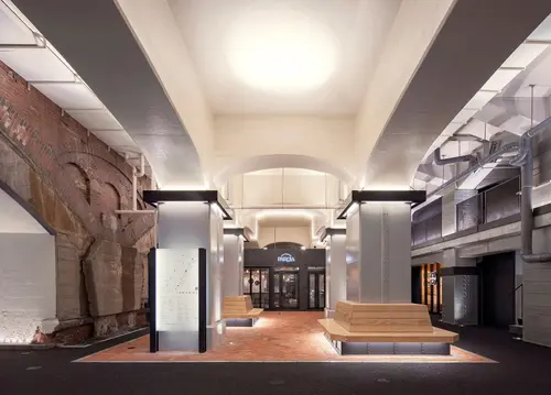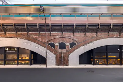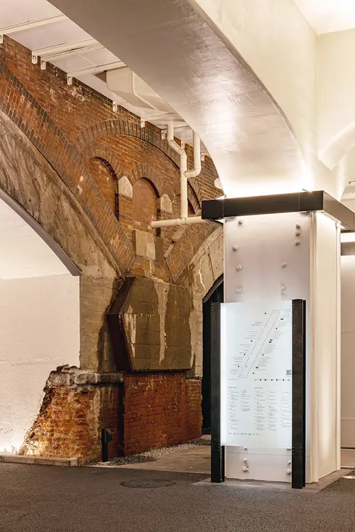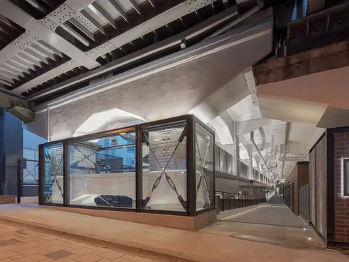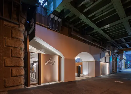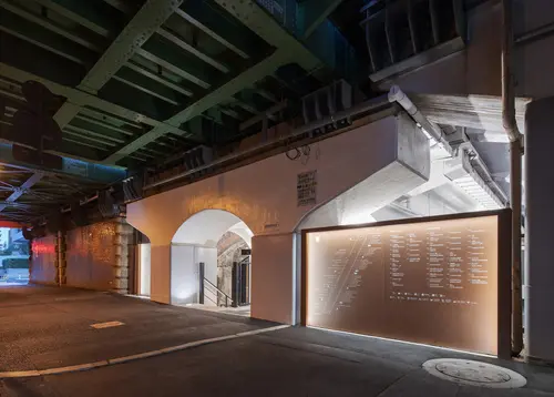 作品意図100年以上の歴史を刻む煉瓦アーチ高架橋が主役となる高架下空間を浮かび上がらせるため、サインは脇役に徹し、ガラス、H形鋼、黒皮鉄、コールテン鋼など、100年の歴史と調和する素材とシンプルなフォルムで構成。日比谷、有楽町、新橋のそれぞれにエントランスがあるため、あえてデザインを統一せず、街の個性に合わせて素材や形状に変化を持たせた。通常の商業施設の案内サインのように、カラフルなロゴ、料理や商品の写真を使わず、統一したフォントとモノトーンのグラフィックにより、シンプルかつシンボリックな表示方法を選択した。
