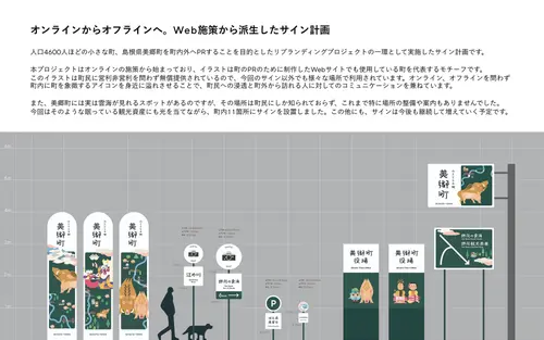 受賞コメント人口4600人ほどの小さな町、島根県美郷町を町内外へPRすることを目的としたリブランディングプロジェクトの一環のサイン計画になります。本プロジェクトはオンラインの施策から始まっており、イラストはWebサイトでも使用している町を代表するモチーフです。オンライン、オフラインを問わず町を象徴するアイコンを身近に溢れさせることで、町民への浸透と町外から訪れる人に対してのコミュニケーションを兼ねています。